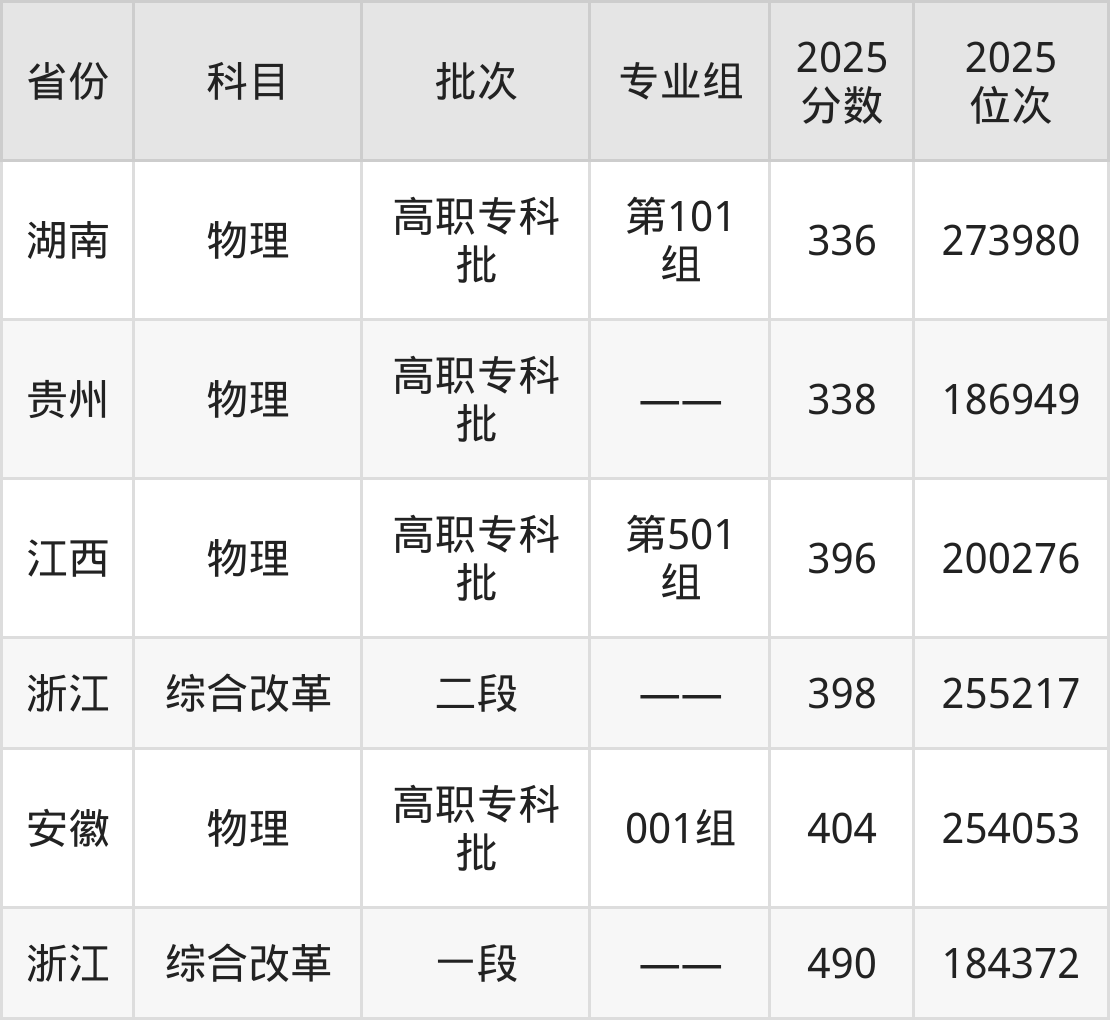 2025年浙江汽车职业技术学院在各省物理类的录取分数线位于336分-404分之间。