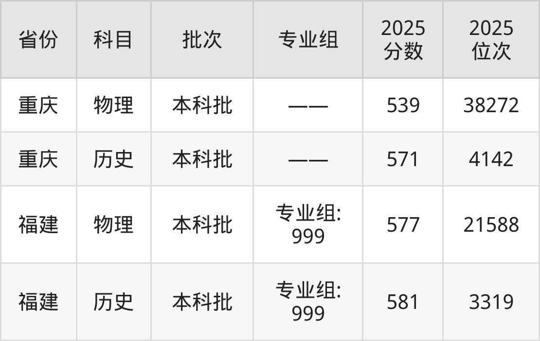 最低录取分数线是539分,对应位次是38272名,招生地区为重庆;