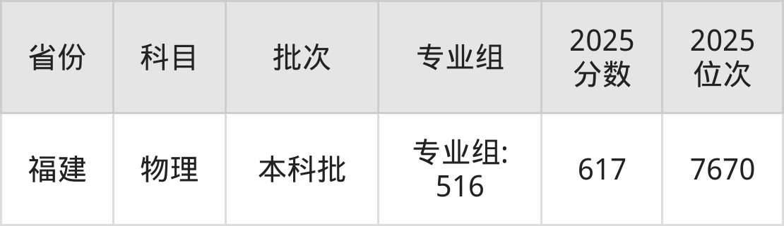 最低录取分数线是617分,对应位次是7670名,招生地区为福建。