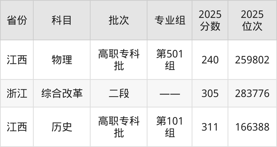 2025年赣东职业技术学院在各省普通批录取分数线一览表: