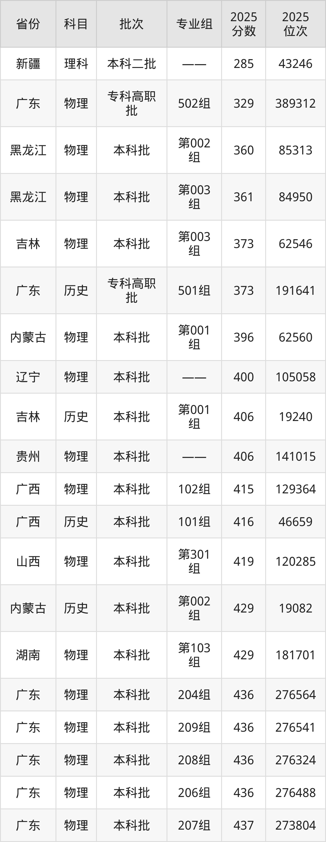 2025年广东理工学院在各省普通批录取分数线一览表: