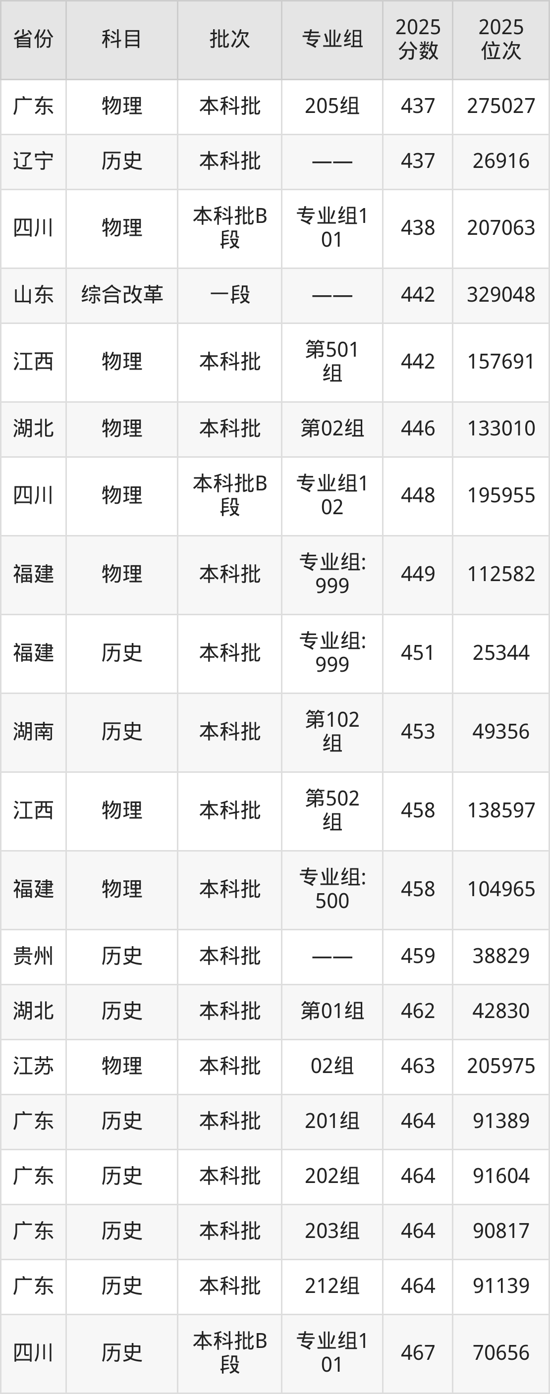 最低录取分数线是442分,对应位次是329048名,招生地区为山东;