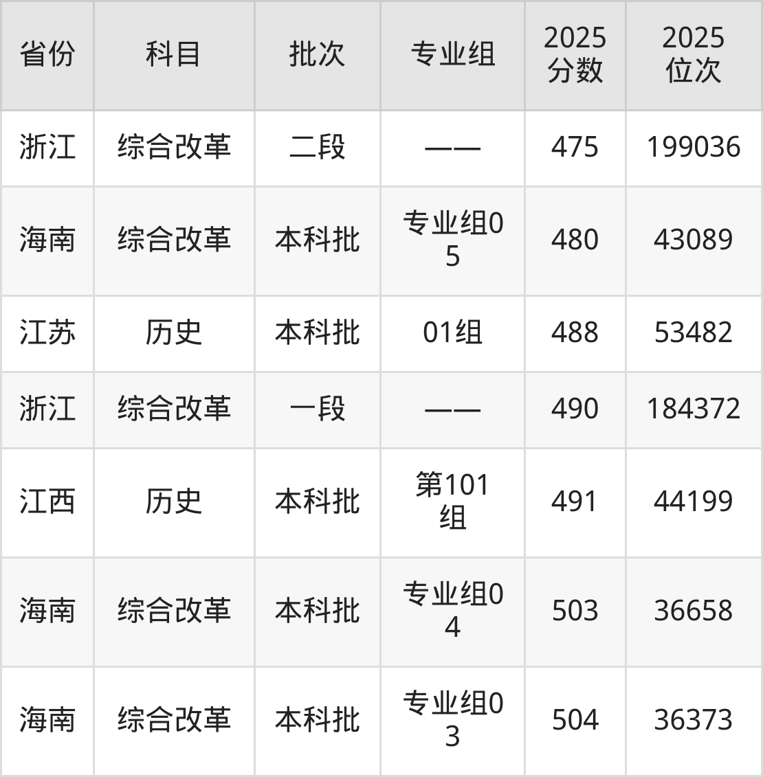 最高录取分数线是504分,对应位次是36373名,招生地区为海南。