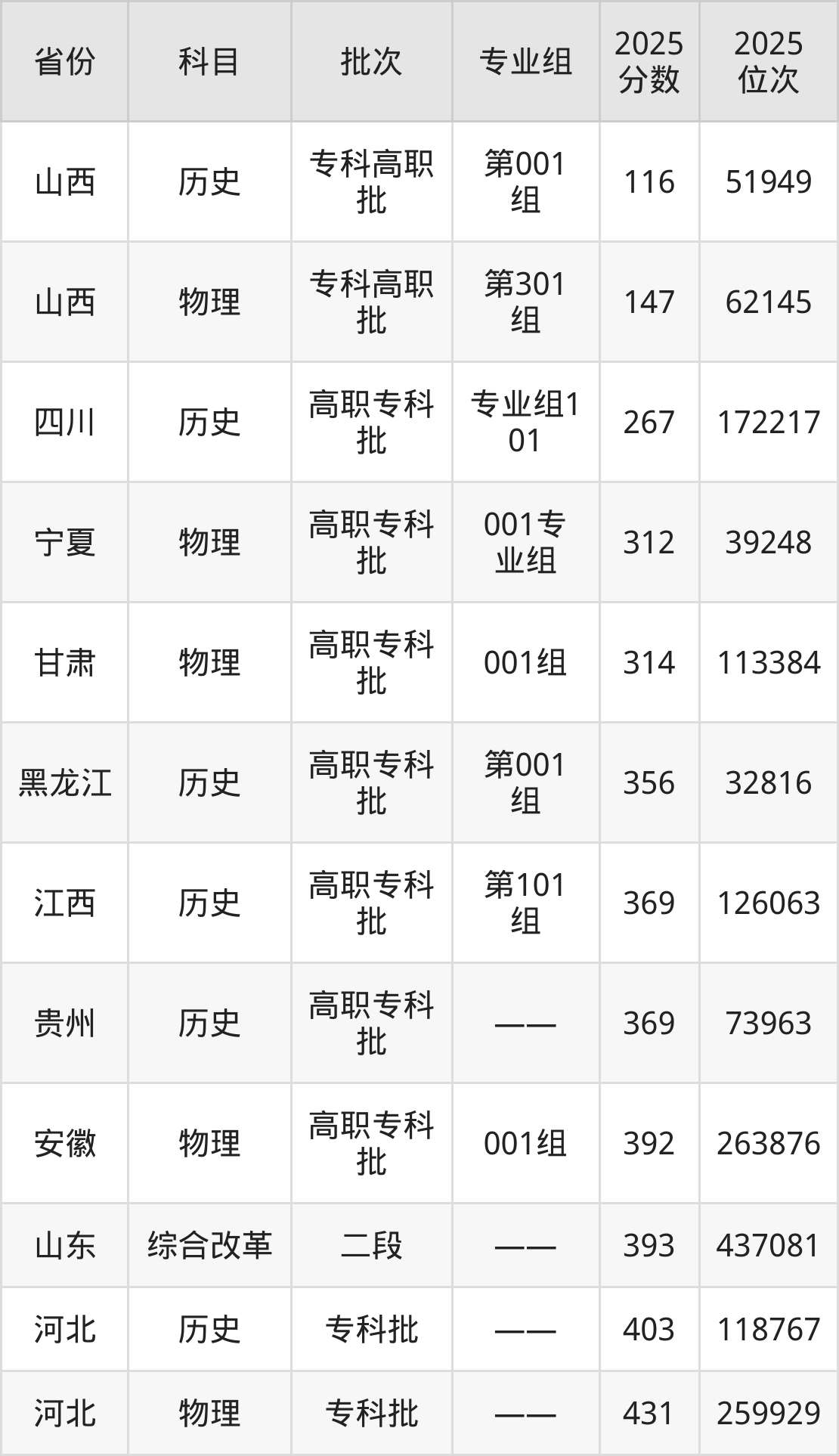 2025年山西老区职业技术学院在各省普通批录取分数线一览表: