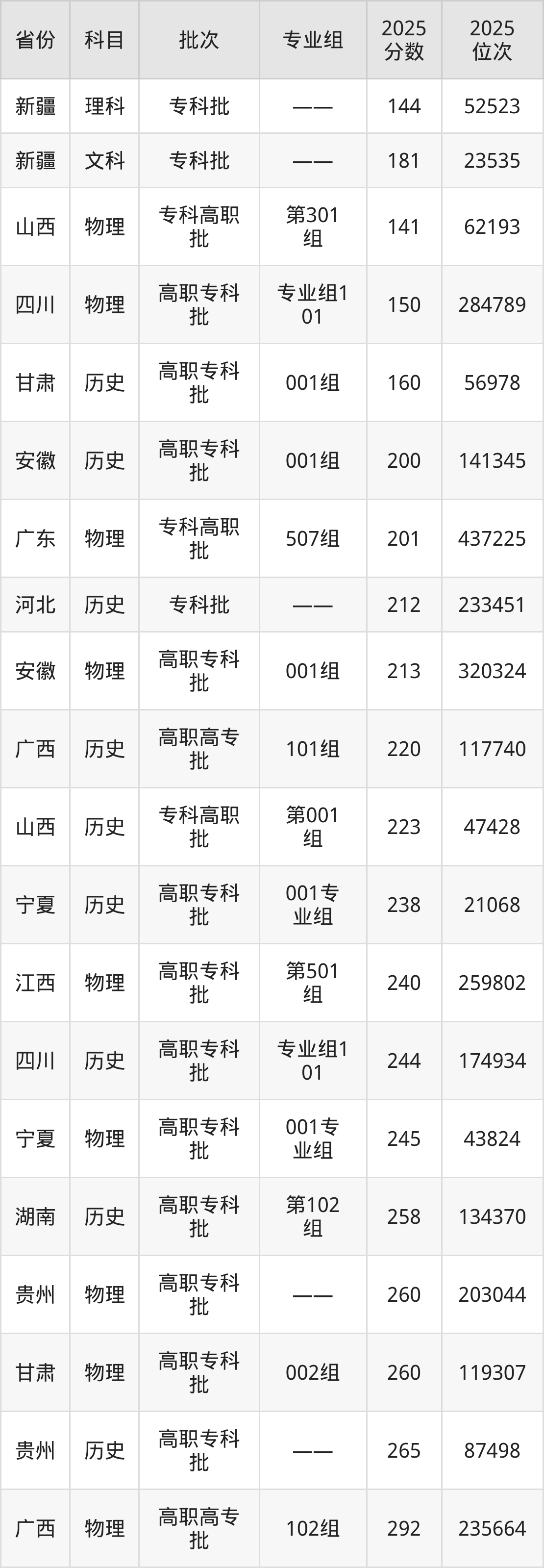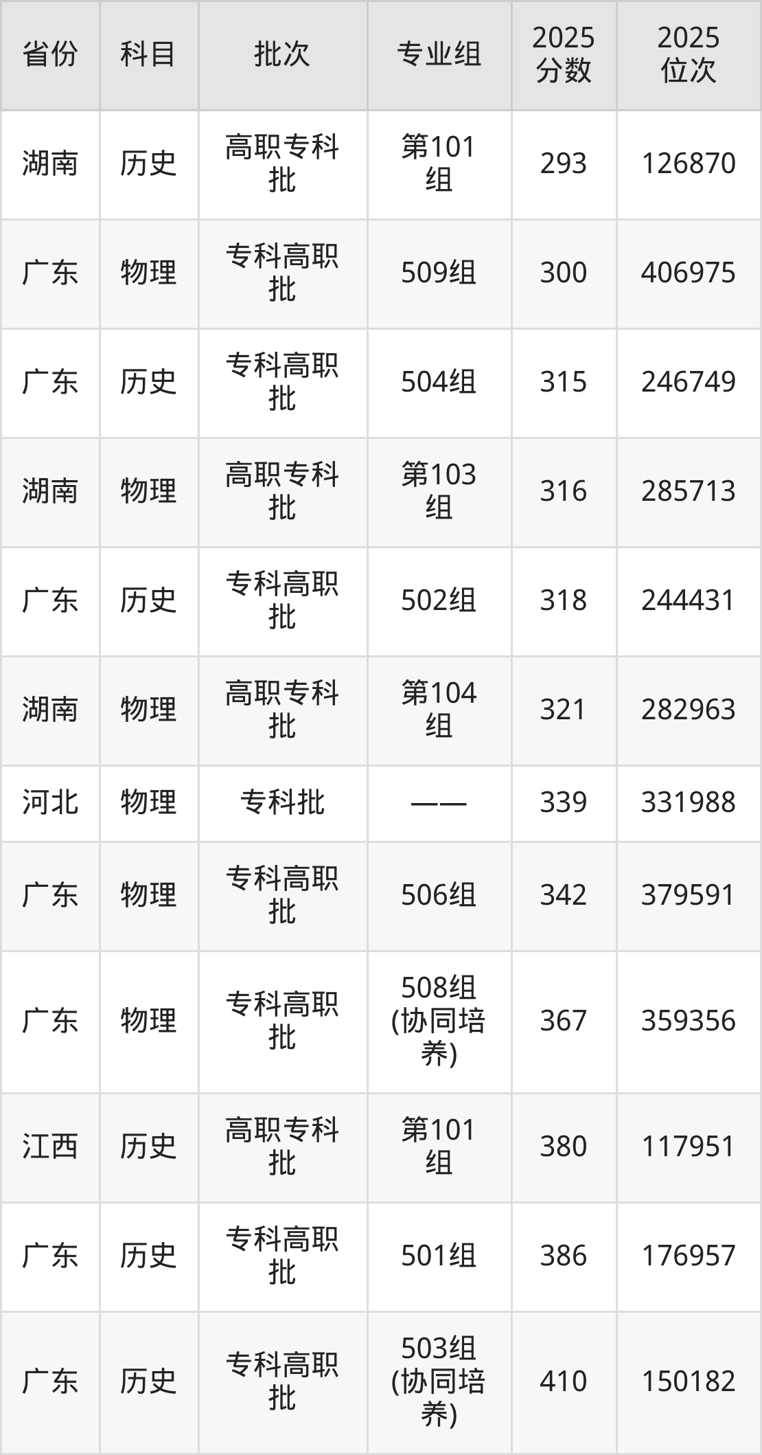 2025年广州城建职业学院在各省普通批录取分数线一览表:
