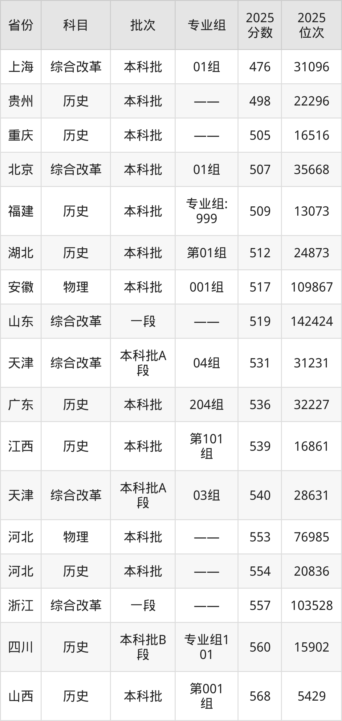 最低录取分数线是476分,对应位次是31096名,招生地区为上海;