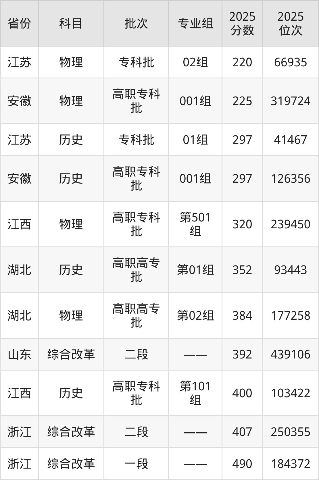 2025年苏州工业园区职业技术学院在各省普通批录取分数线一览表: