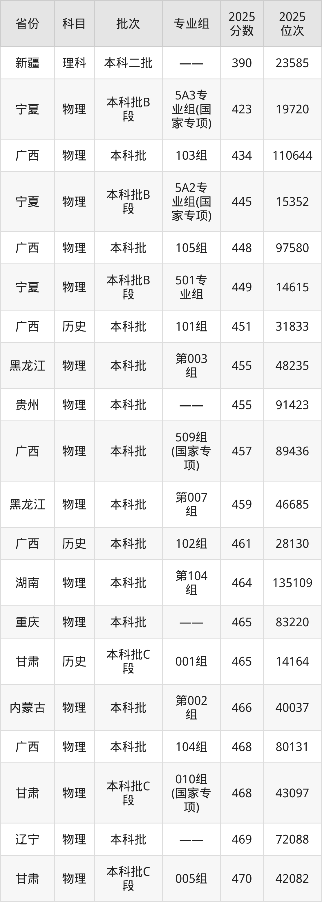 最低录取分数线是451分,对应位次是31833名,招生地区为广西;