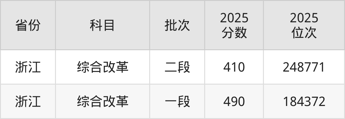 最低录取分数线是410分,对应位次是248771名,招生地区为浙江;