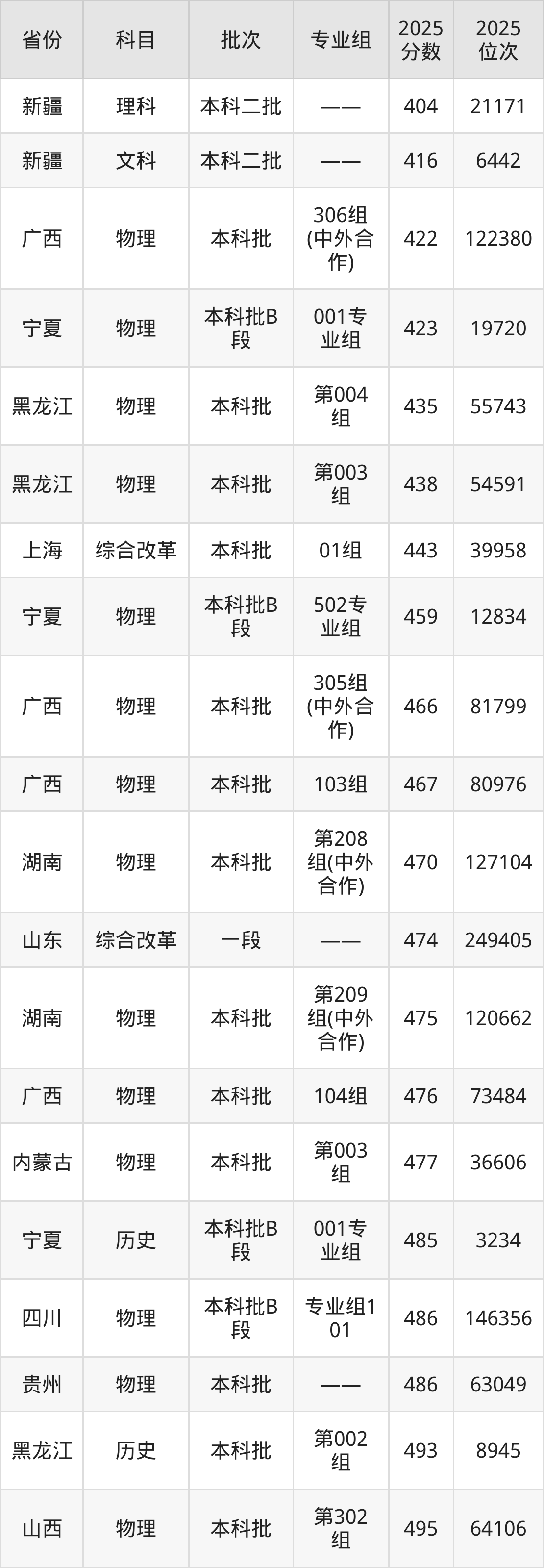 最低录取分数线是404分,对应位次是21171名,招生地区为新疆;