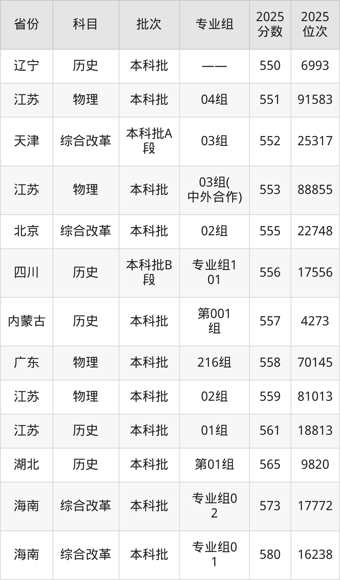 最高录取分数线是580分,对应位次是16238名,招生地区为海南。