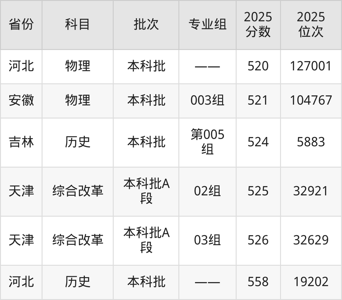 最高录取分数线是526分,对应位次是32629名,招生地区为天津。