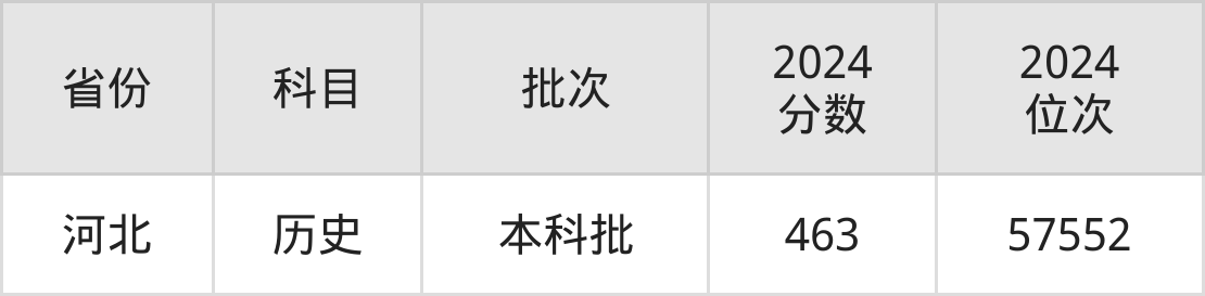 最低录取分数线是463分,对应位次是57552名,招生地区为河北。