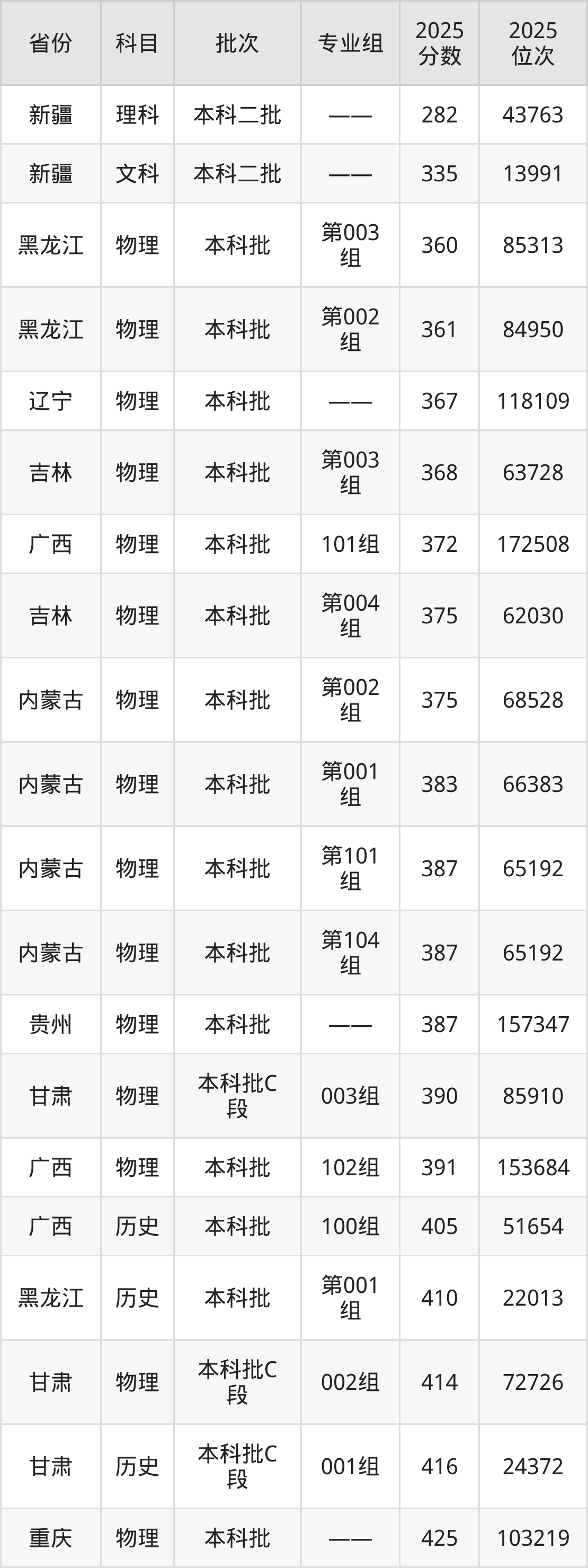 最低录取分数线是282分,对应位次是43763名,招生地区为新疆;