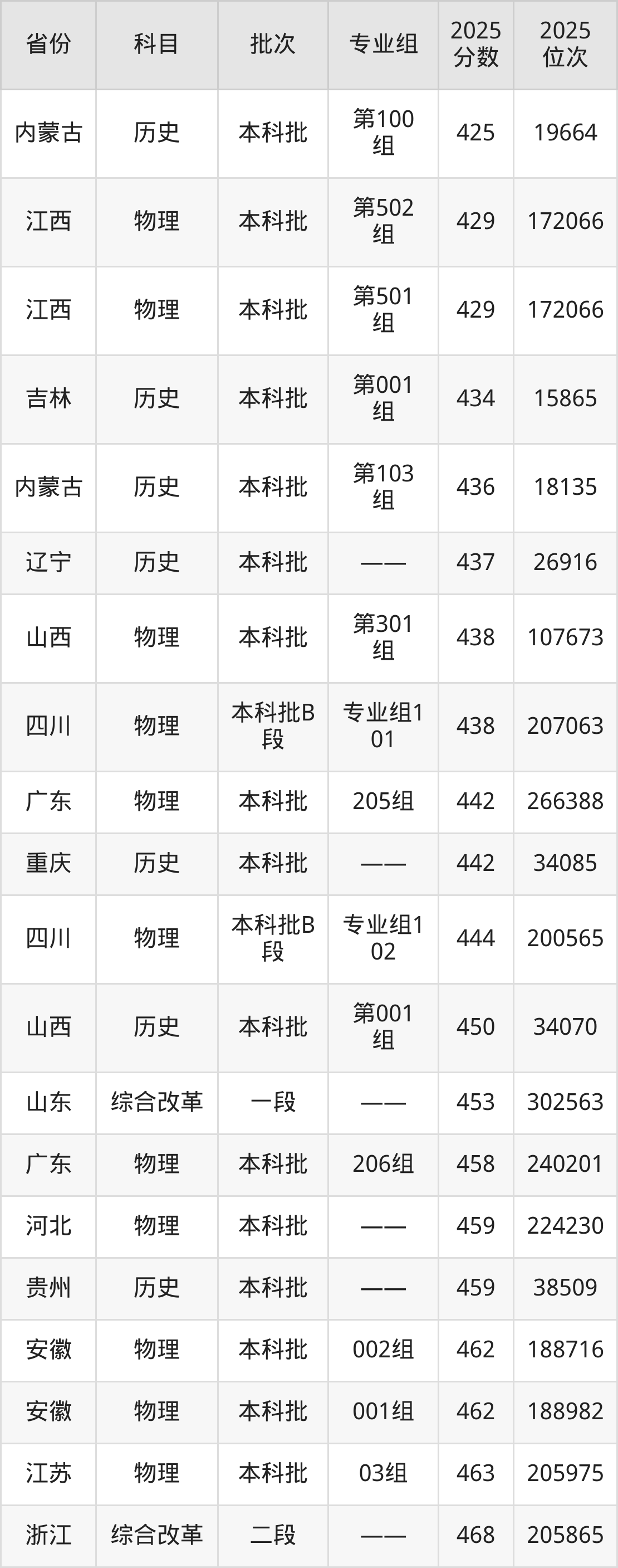 最低录取分数线是453分,对应位次是302563名,招生地区为山东;