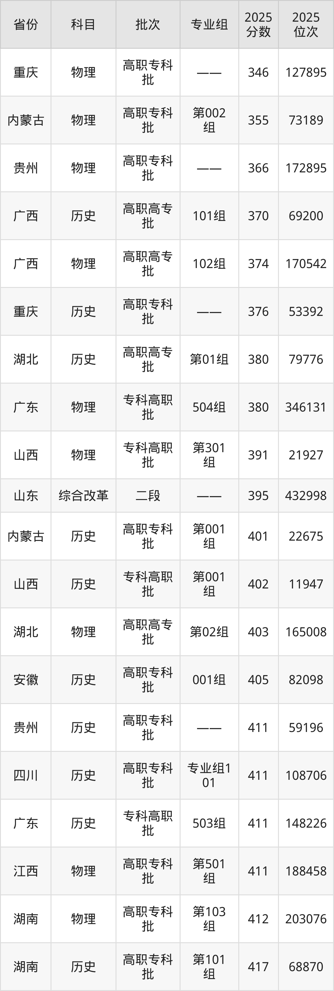 2025年湖南机电职业技术学院在各省3+3综合改革的录取分数线为395分。