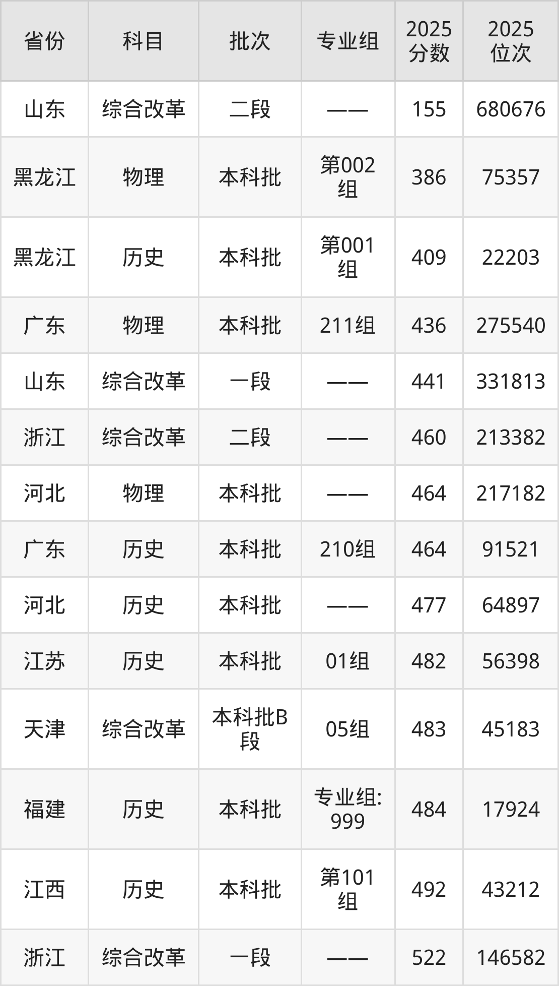 最低录取分数线是155分,对应位次是680676名,招生地区为山东;