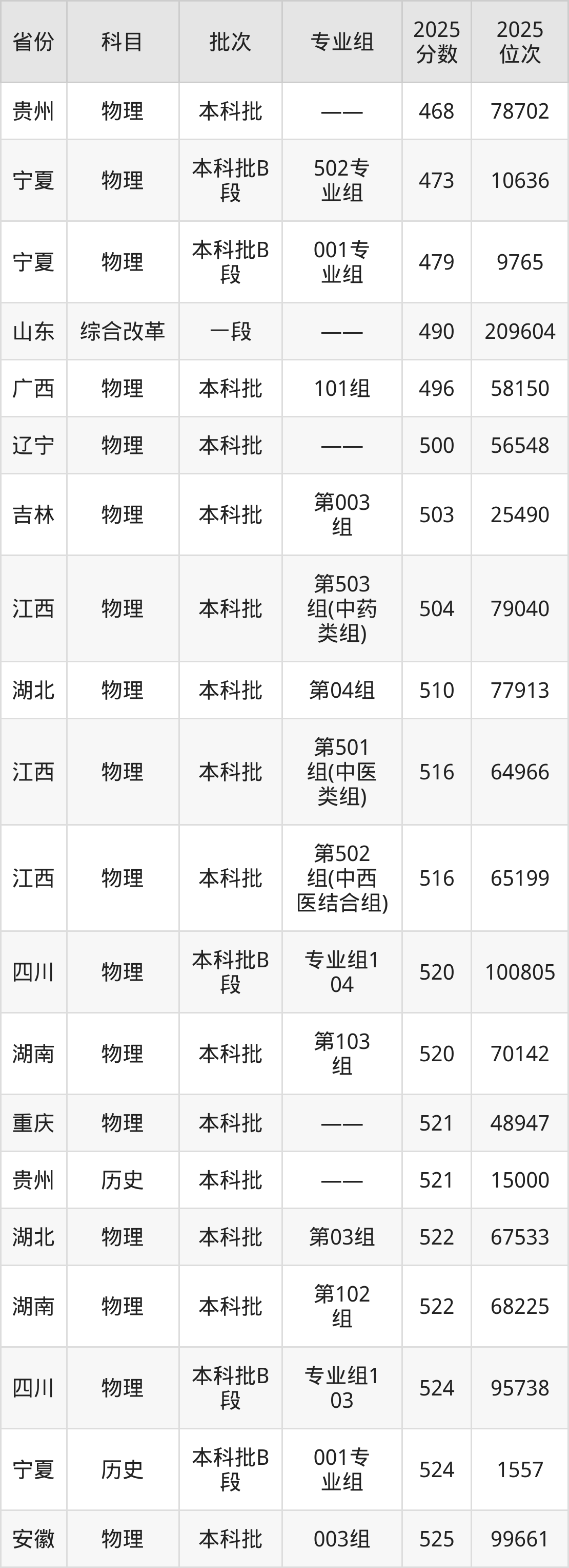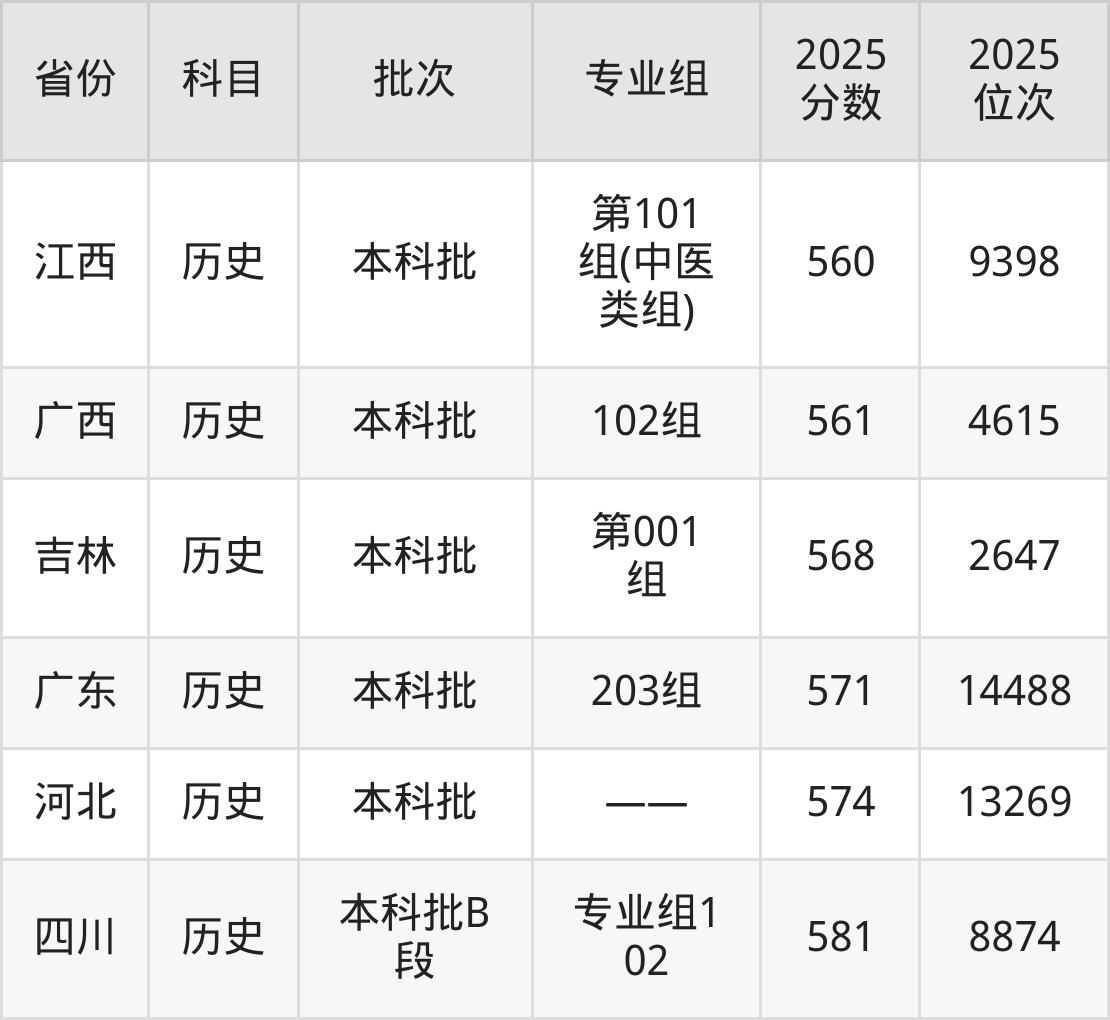2025年重庆中医药学院在各省普通批录取分数线一览表: