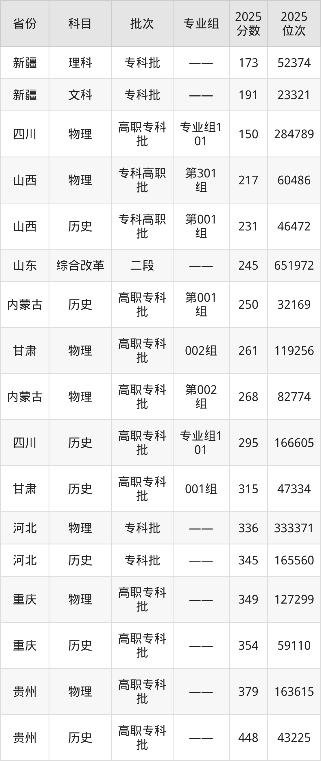 2025年阿克苏工业职业技术学院在各省普通批录取分数线一览表: