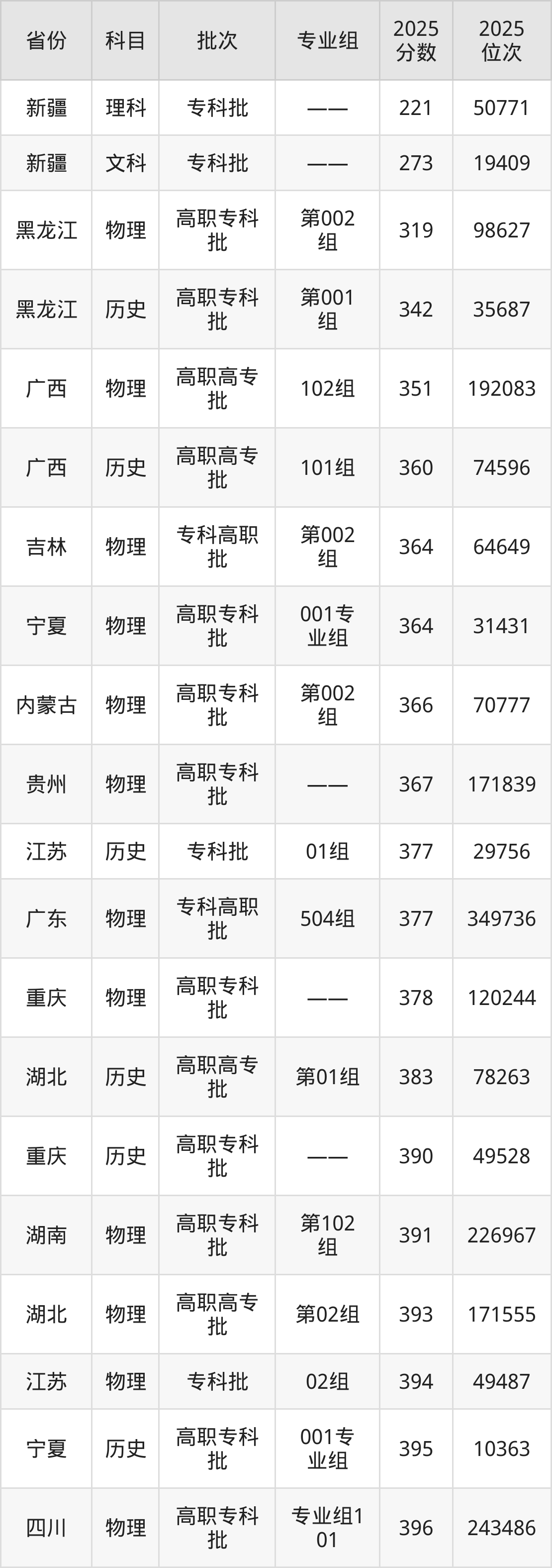 2025年黑龙江交通职业技术学院在各省普通批录取分数线一览表: