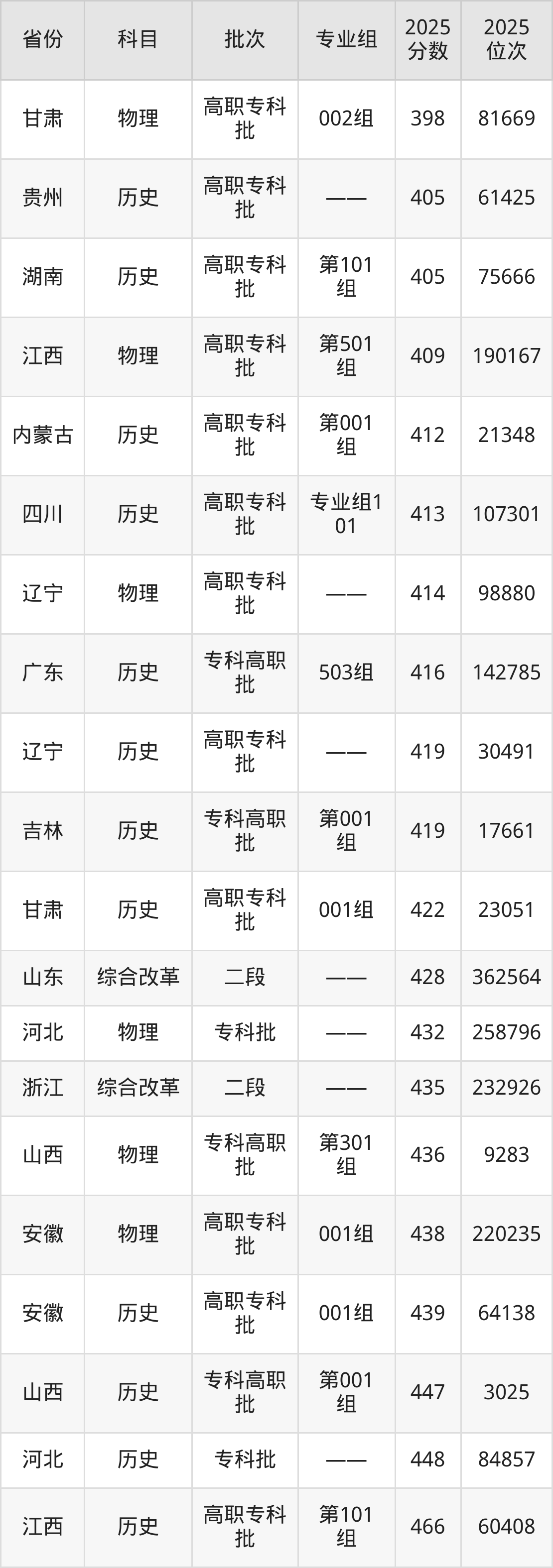 最高录取分数线是435分,对应位次是232926名,招生地区为浙江。