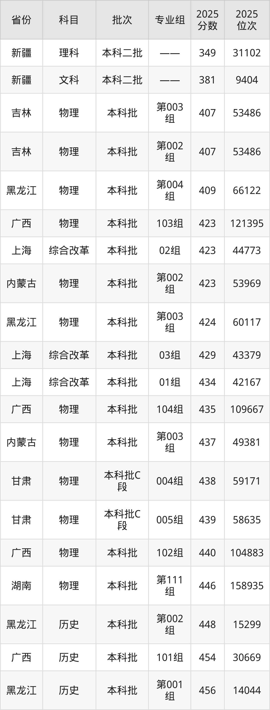最低录取分数线是381分,对应位次是9404名,招生地区为新疆;