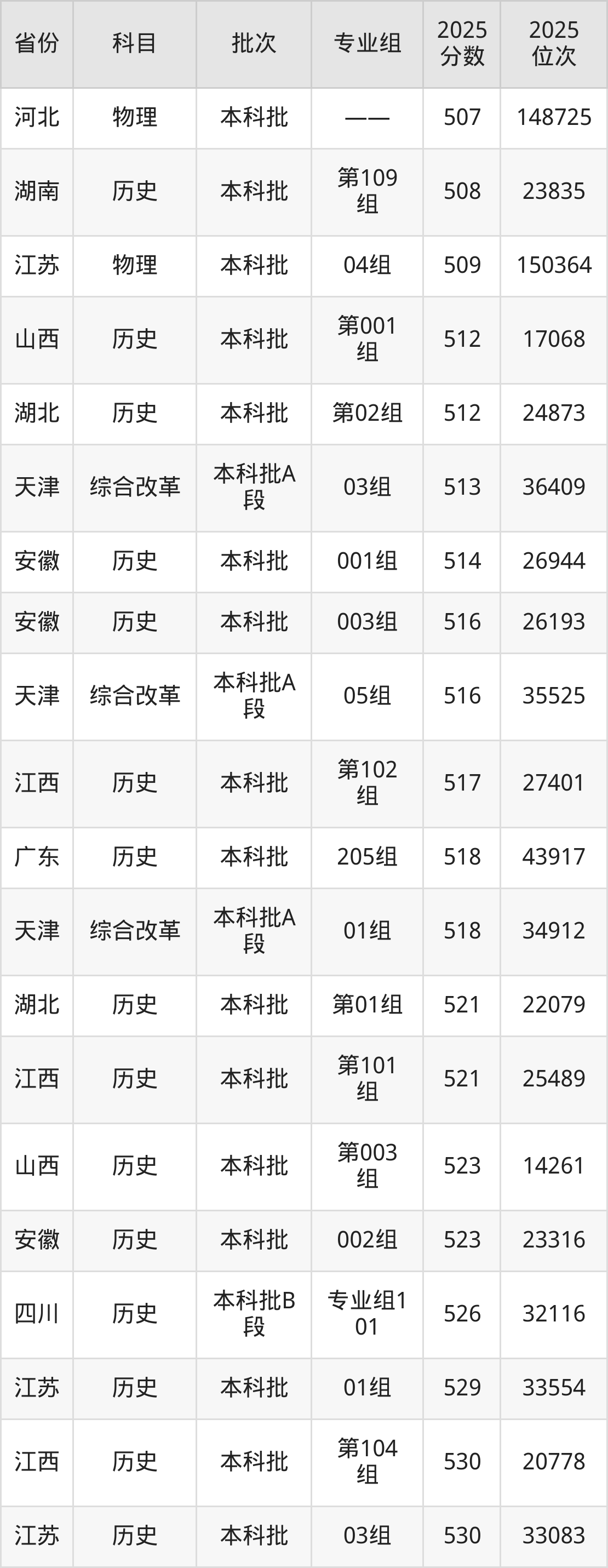 最高录取分数线是509分,对应位次是150364名,招生地区为江苏。