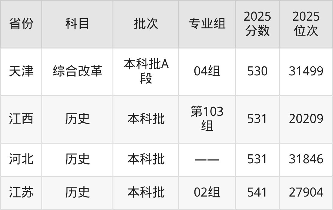 最高录取分数线是530分,对应位次是31499名,招生地区为天津。
