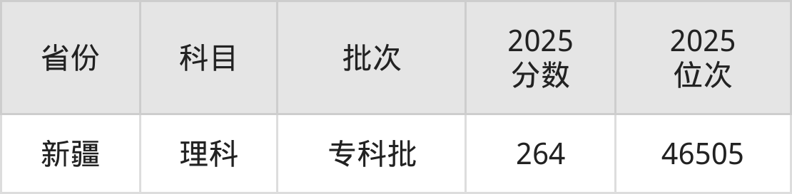 最低录取分数线是264分,对应位次是46505名,招生地区为新疆。