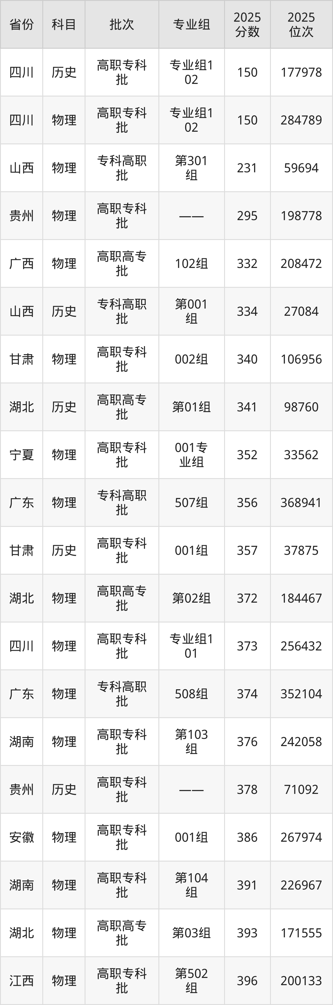 最低录取分数线是150分,对应位次是177978名,招生地区为四川;