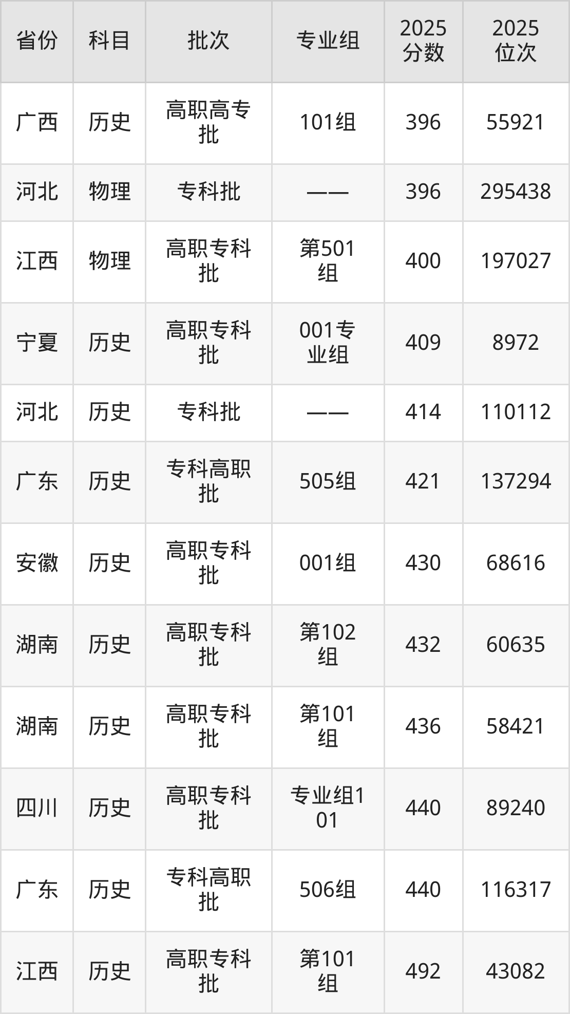 最高录取分数线是400分,对应位次是197027名,招生地区为江西。