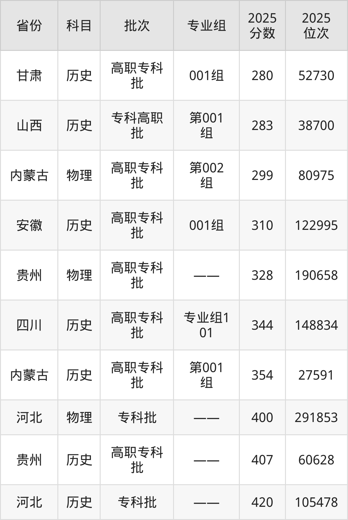 2025年河北正定师范高等专科学校在各省普通批录取分数线一览表: