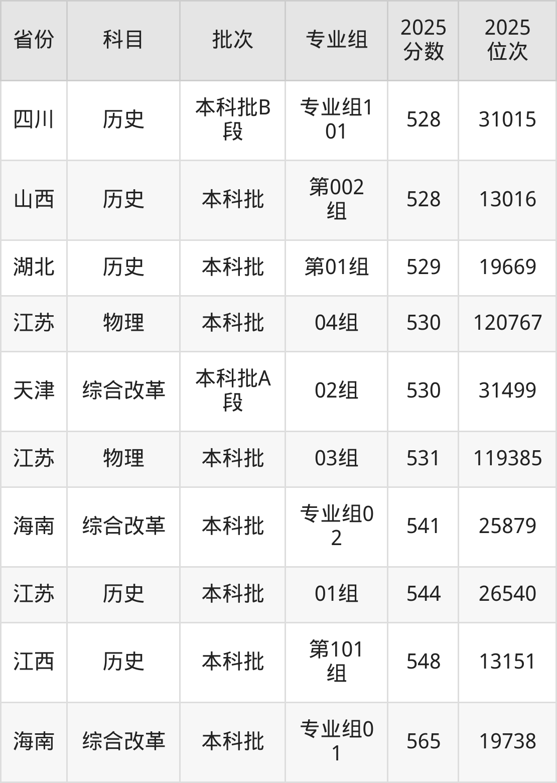 最高录取分数线是565分,对应位次是19738名,招生地区为海南。