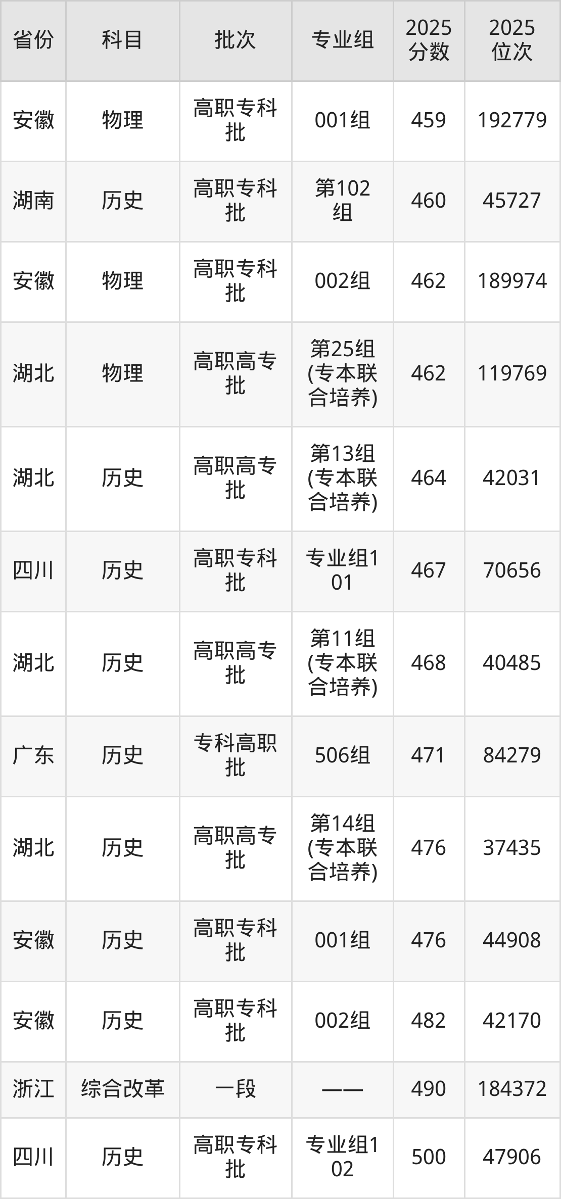 2025年襄阳职业技术学院在各省普通批录取分数线一览表: