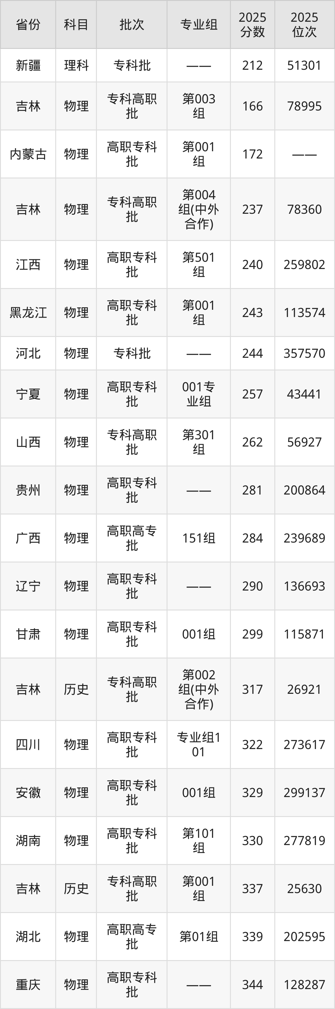 2025年辽源职业技术学院在各省普通批录取分数线一览表: