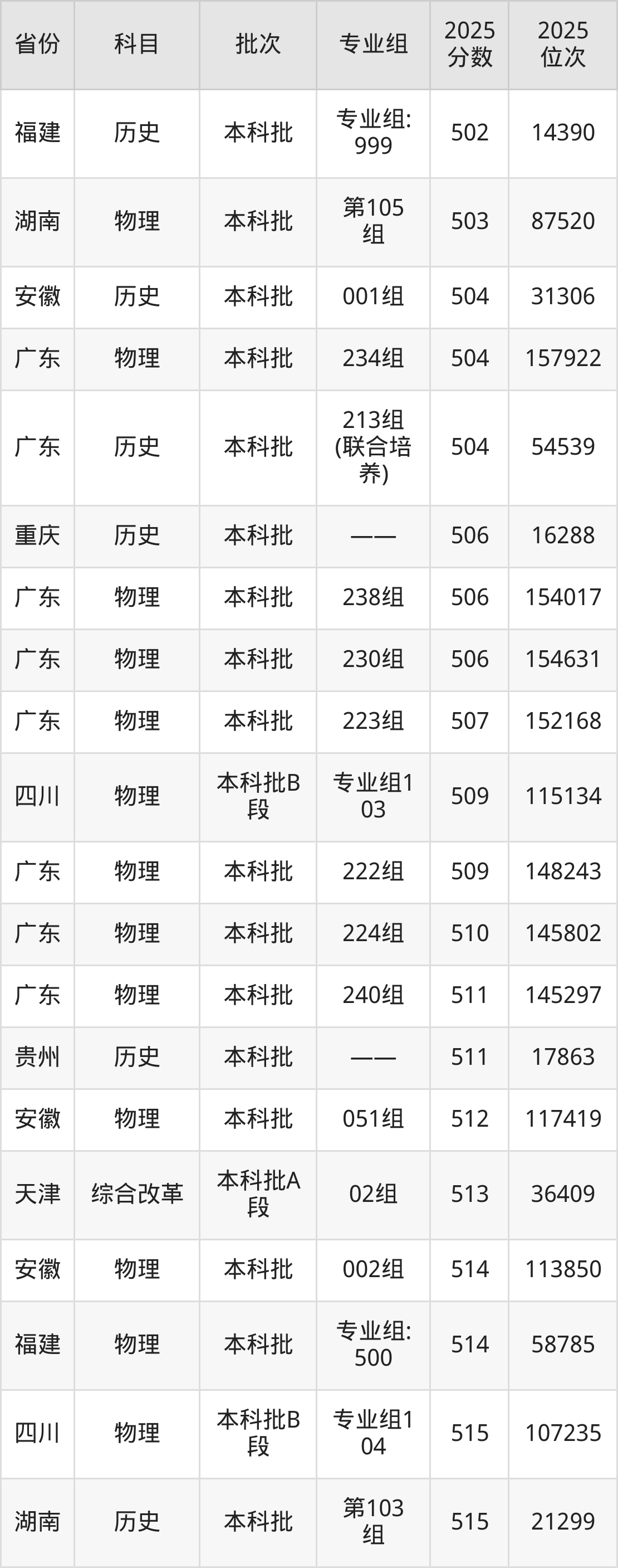 最低录取分数线是501分,对应位次是184444名,招生地区为山东;