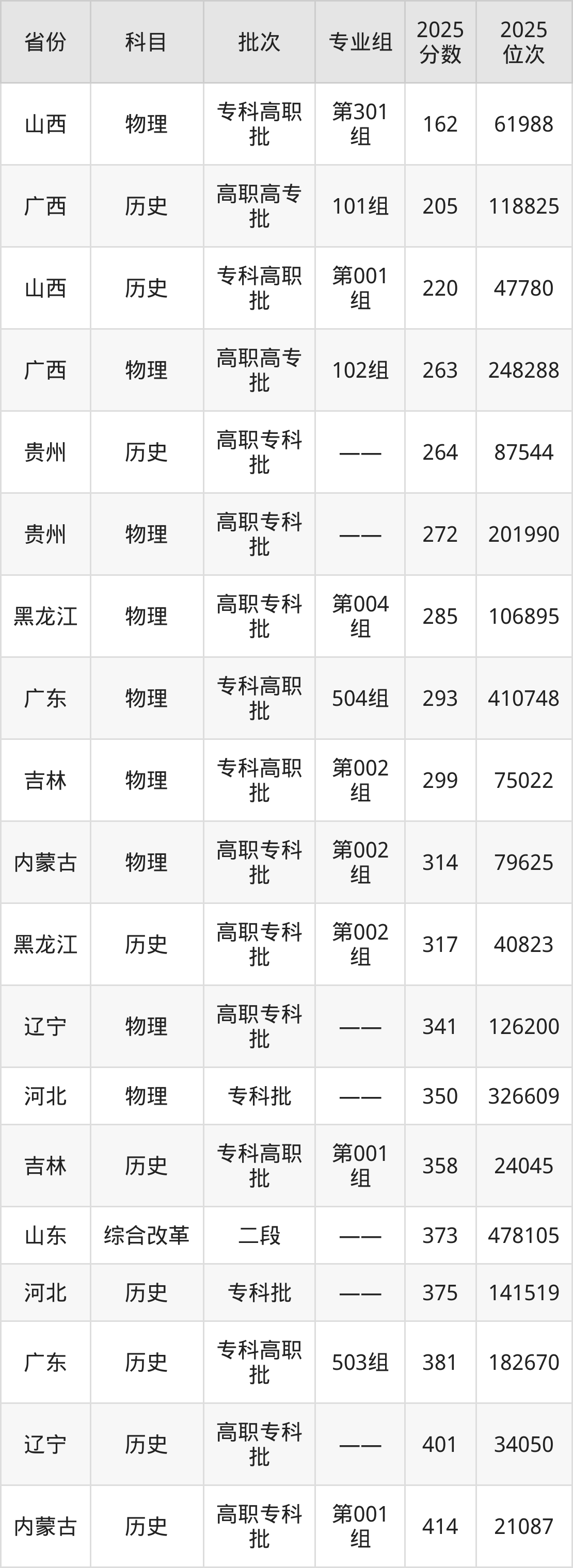 最低录取分数线是205分,对应位次是118825名,招生地区为广西;