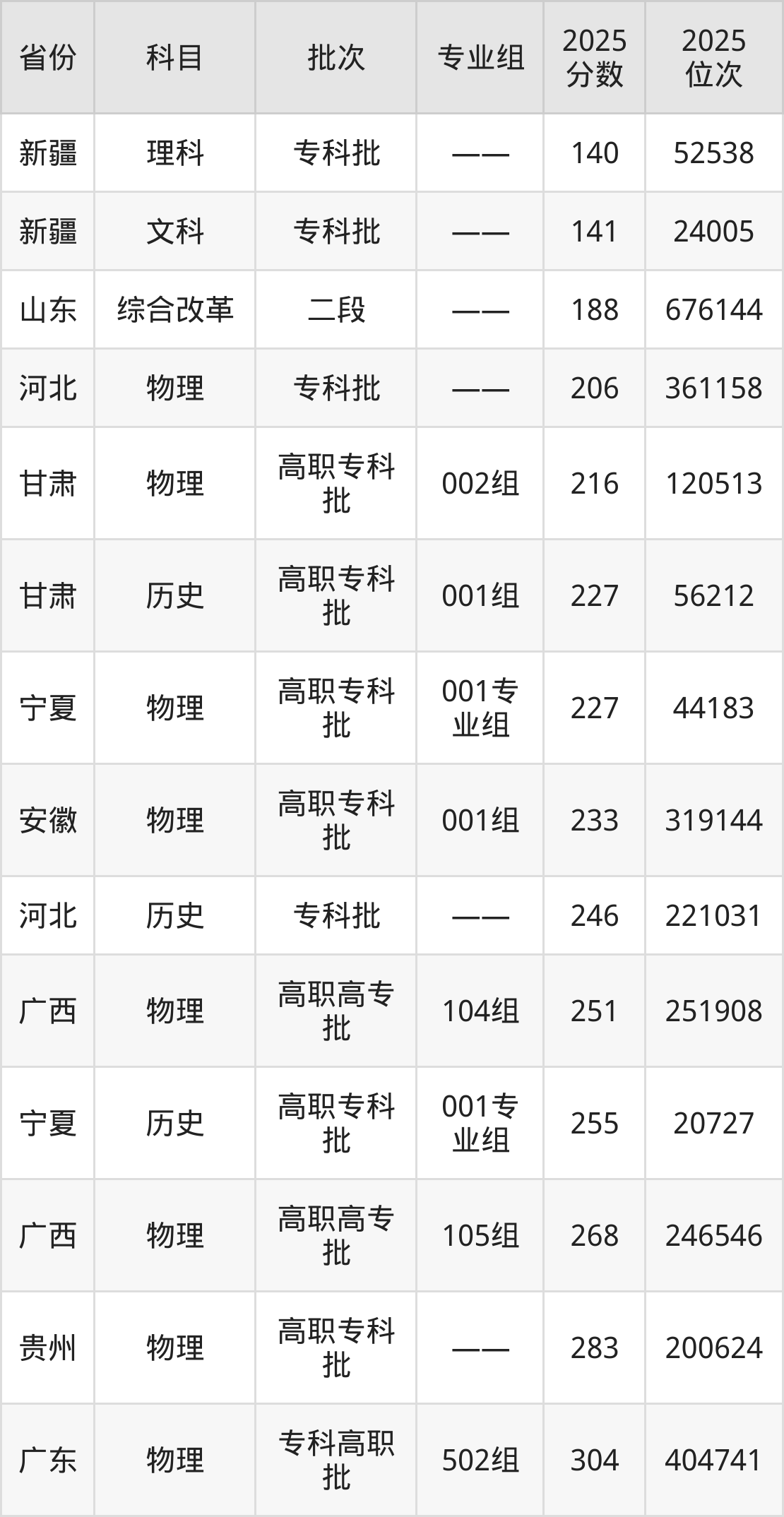 2025年新疆科技职业技术学院在各省物理类和理科的录取分数线位于140分-304分之间。