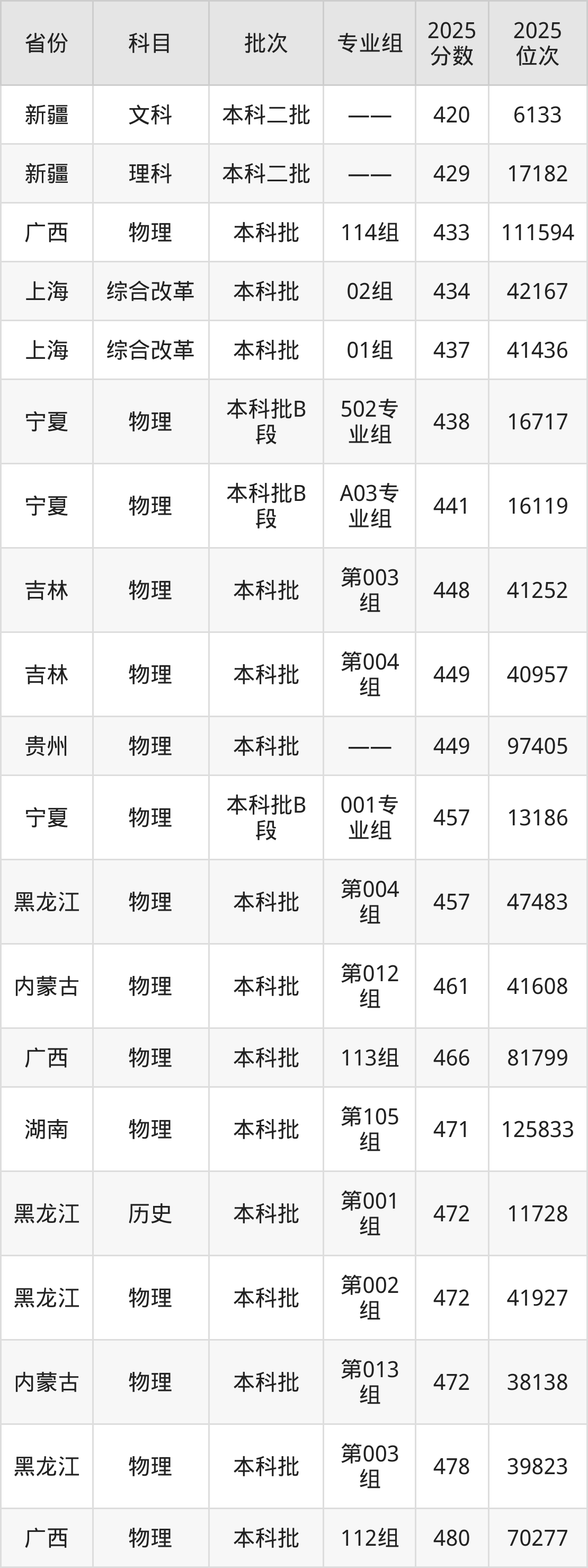 最低录取分数线是420分,对应位次是6133名,招生地区为新疆;