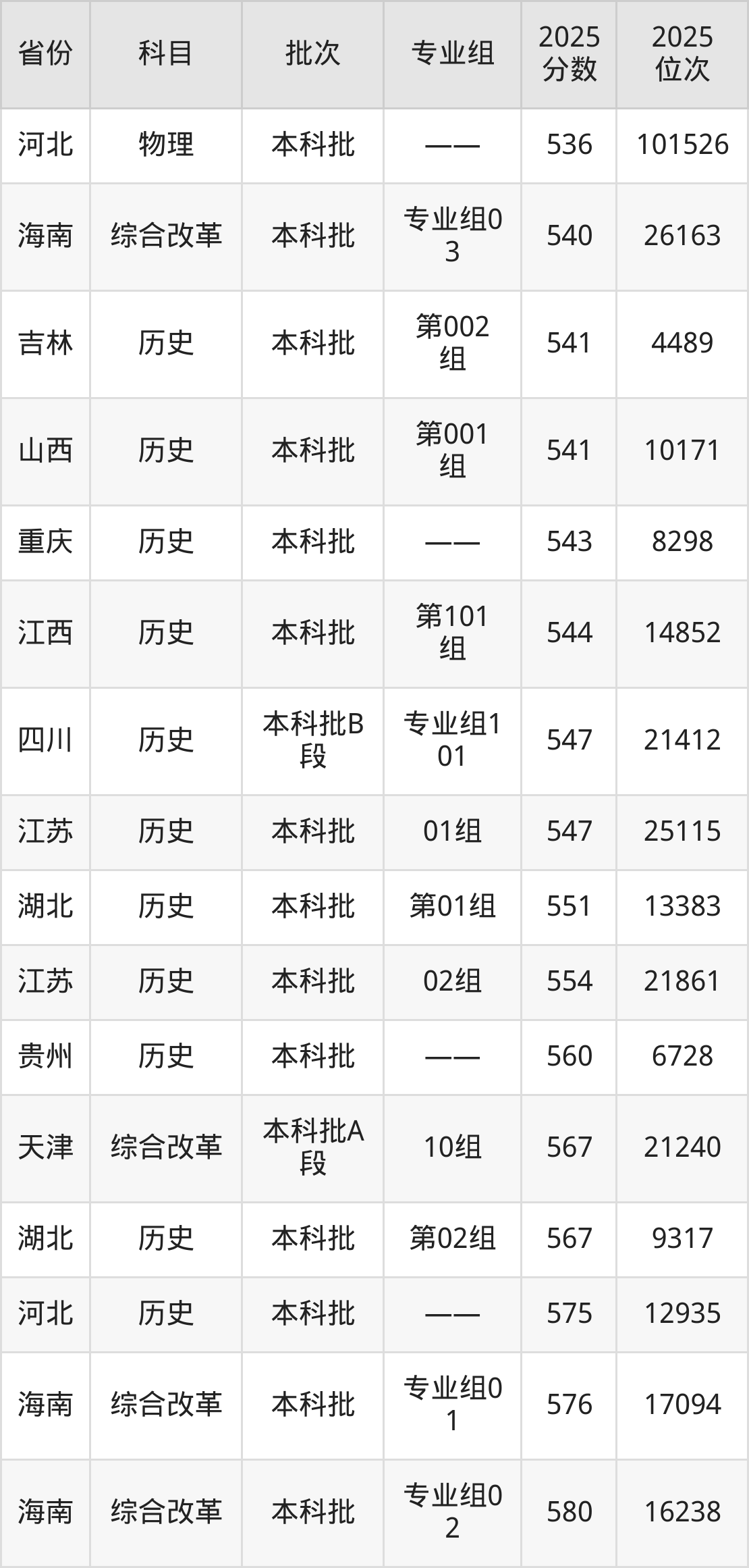最高录取分数线是580分,对应位次是16238名,招生地区为海南。
