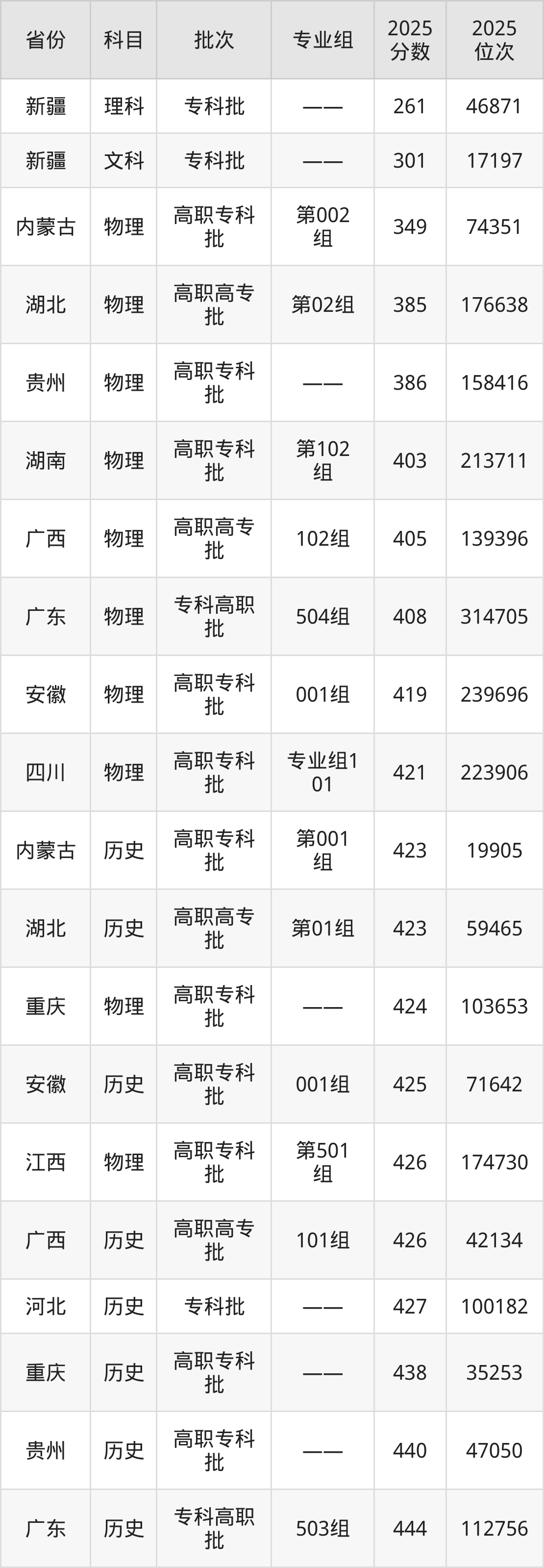 最低录取分数线是301分,对应位次是17197名,招生地区为新疆;