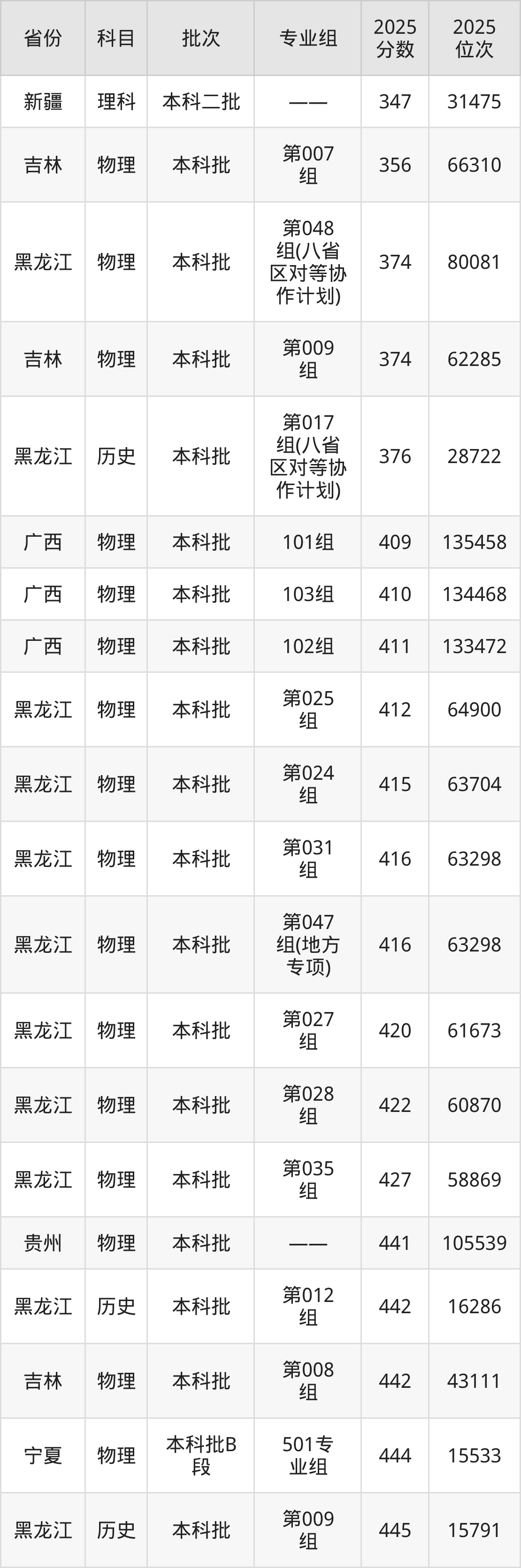 最低录取分数线是376分,对应位次是28722名,招生地区为黑龙江;