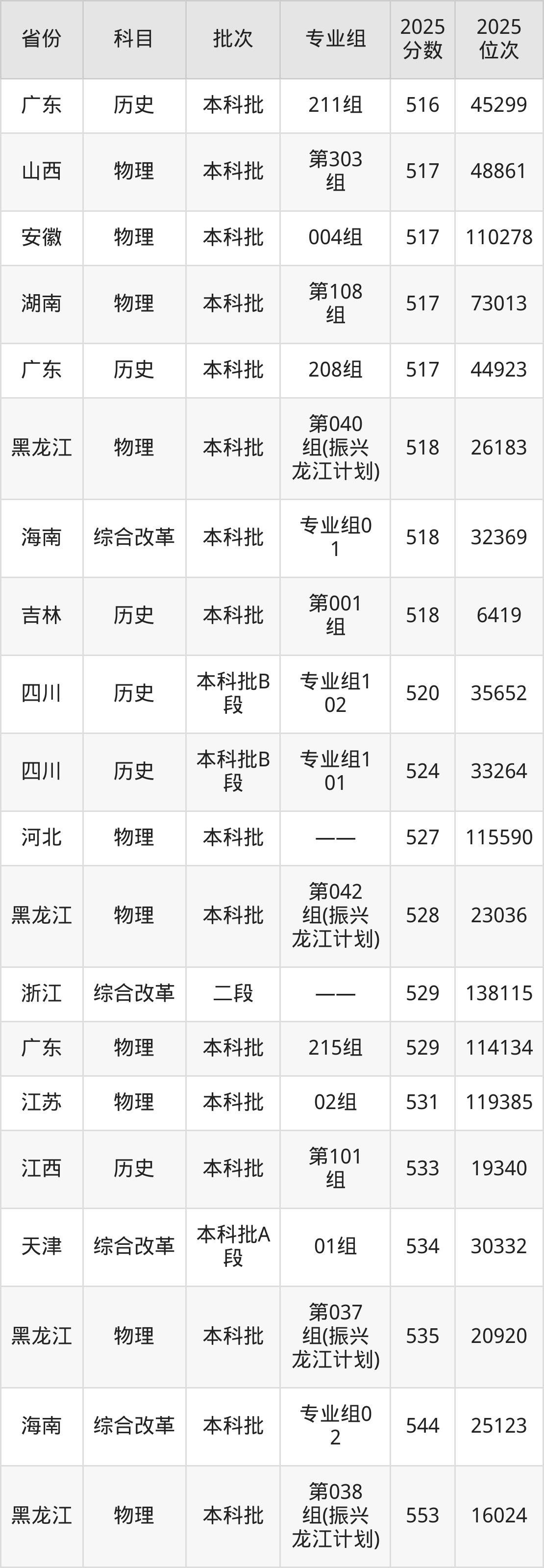 最高录取分数线是544分,对应位次是25123名,招生地区为海南。