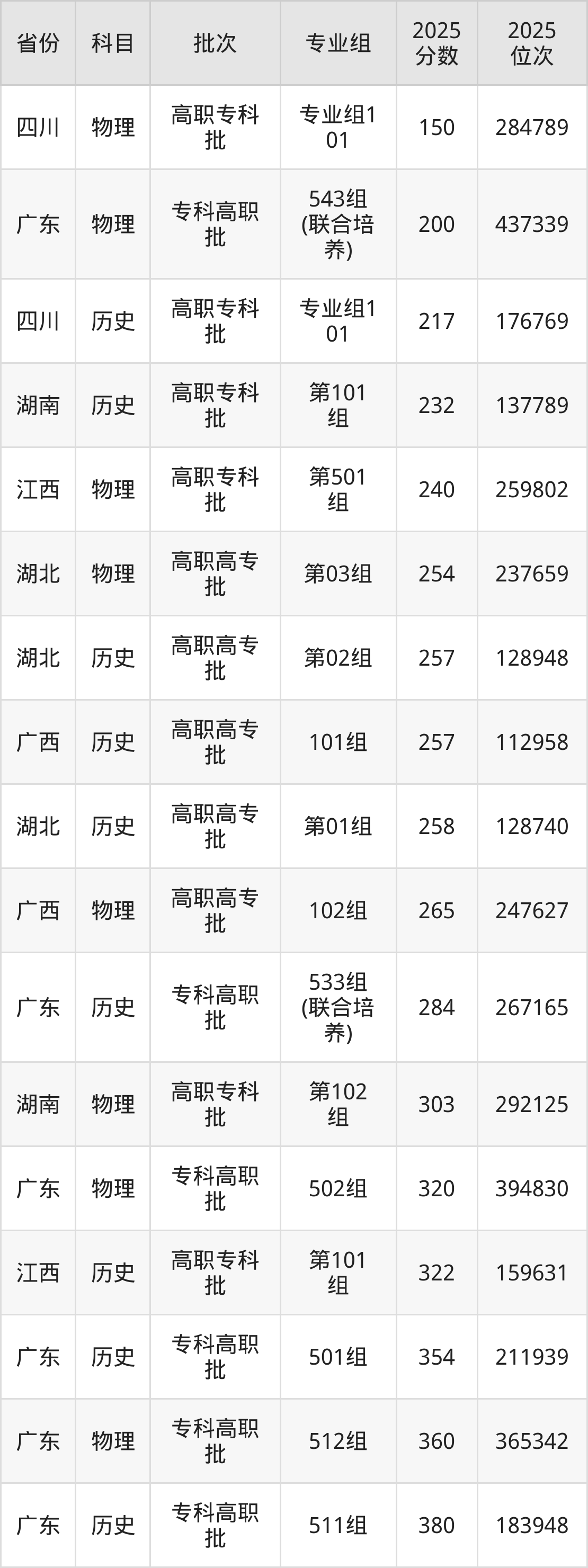 2025年广州松田职业学院在各省普通批录取分数线一览表: