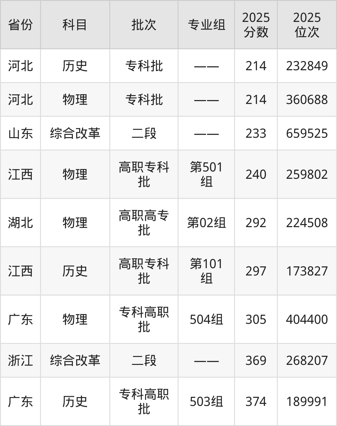2025年衡阳科技职业学院在各省普通批录取分数线一览表:
