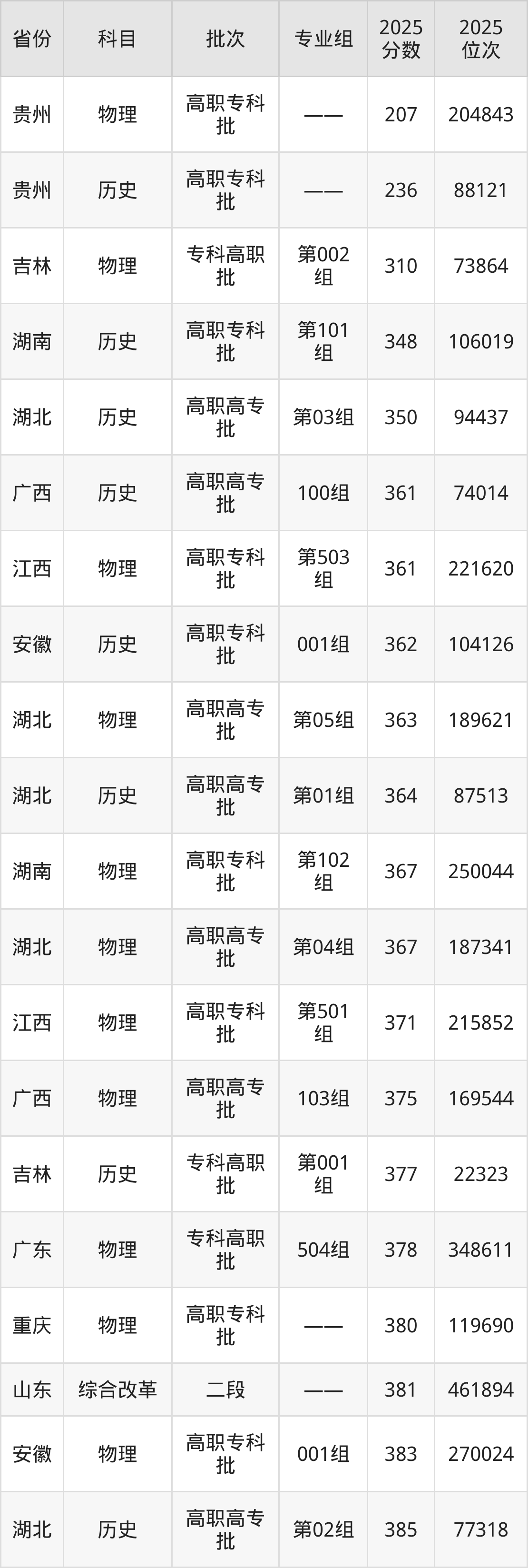 2025年贵州机电职业技术学院在各省3+3综合改革的录取分数线为381分。