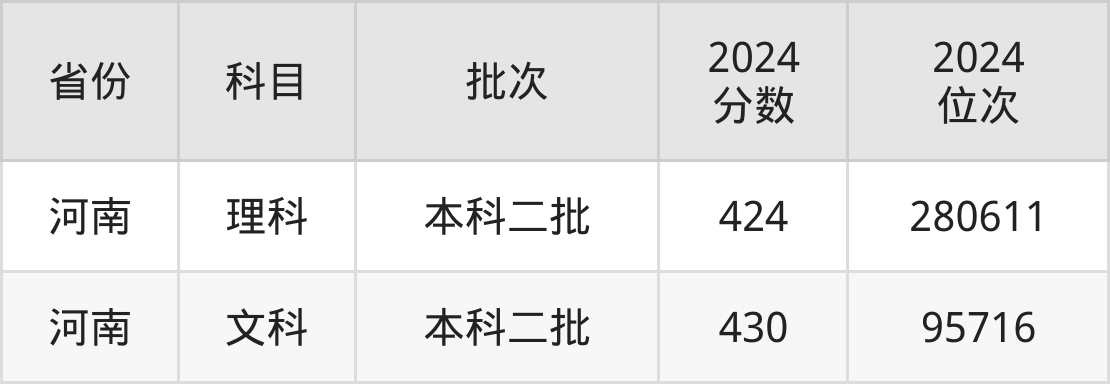 最低录取分数线是424分,对应位次是280611名,招生地区为河南。
