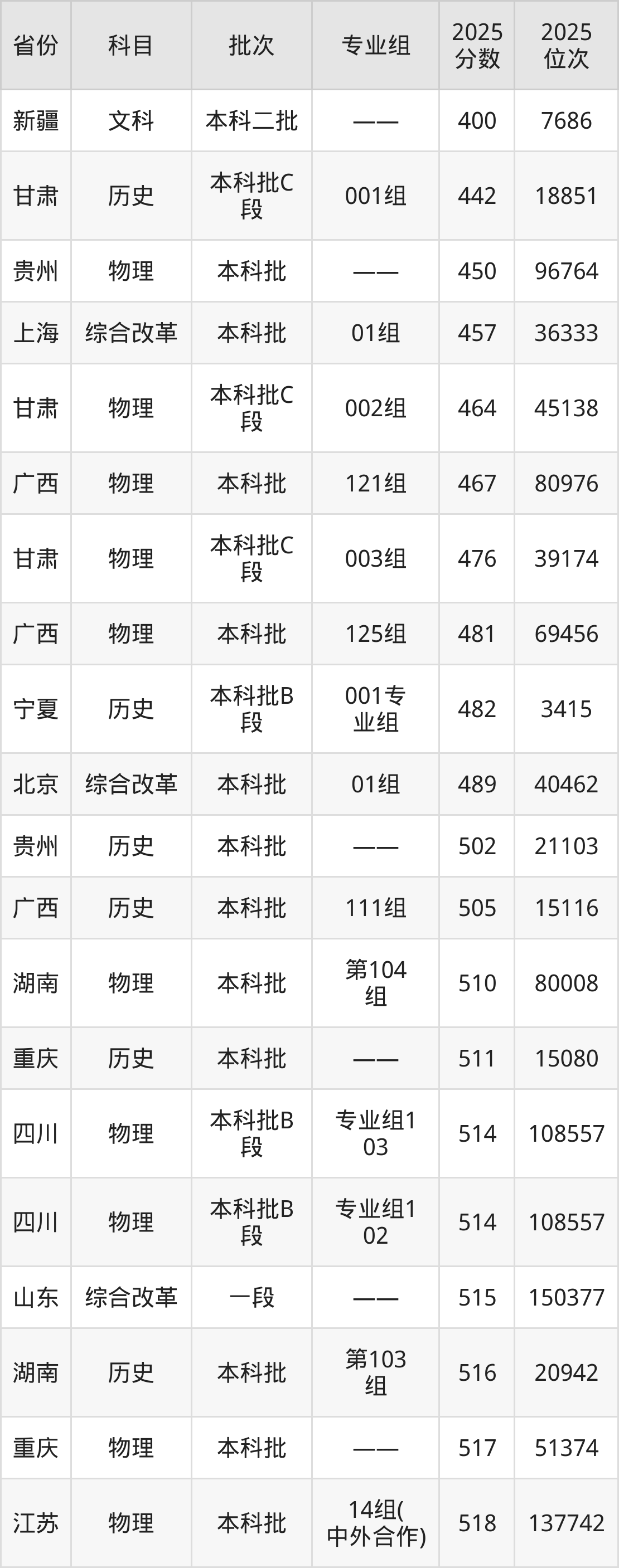 最低录取分数线是400分,对应位次是7686名,招生地区为新疆;