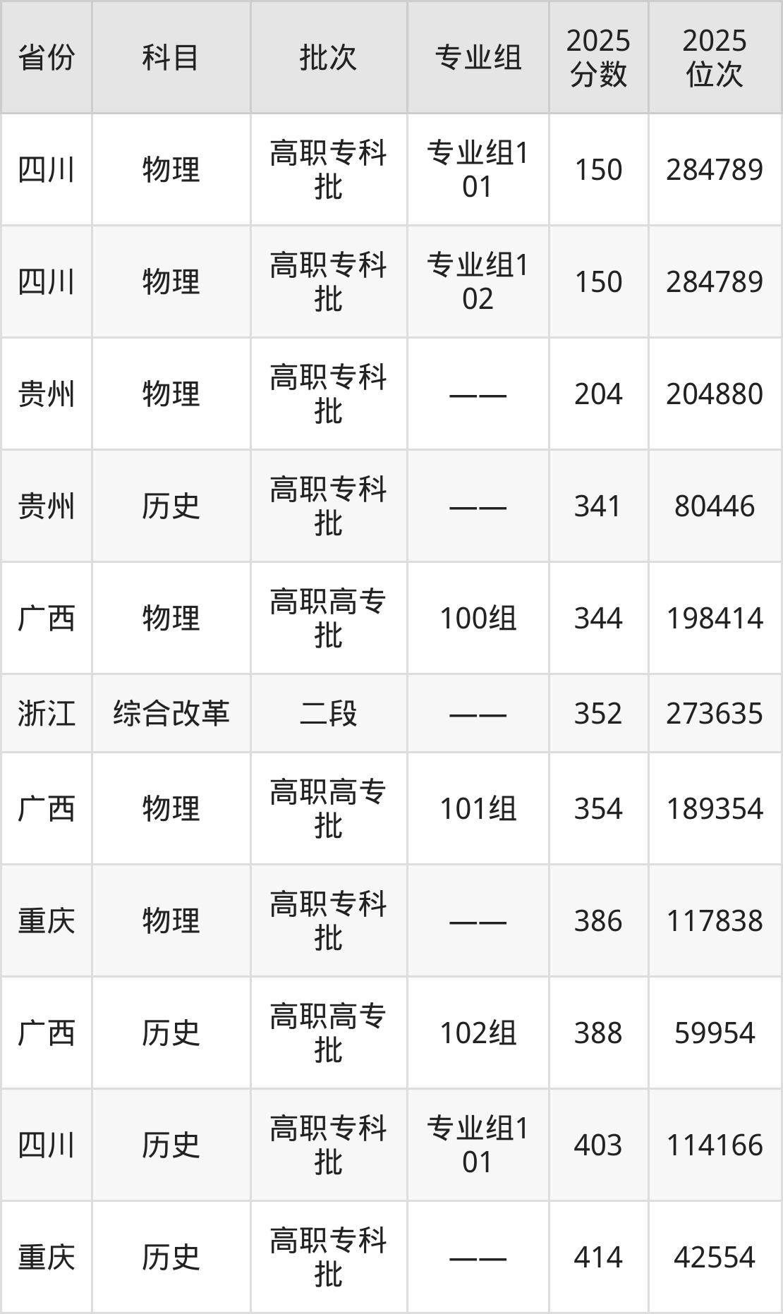 最低录取分数线是150分,对应位次是284789名,招生地区为四川;