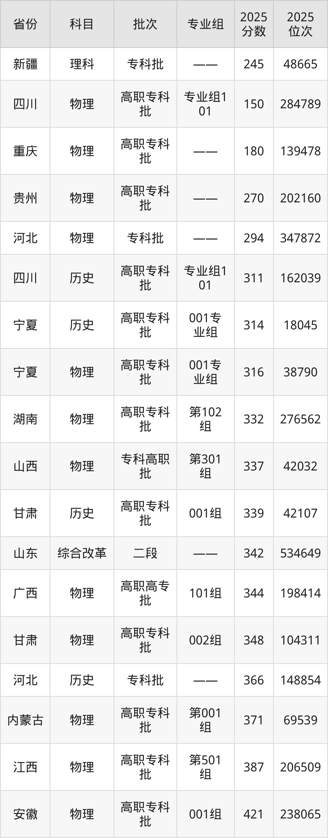 2025年汉中职业技术学院在各省普通批录取分数线一览表: